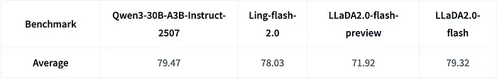 在下面,你可以看到LLaDA 2.0 Flash在基准测试上与Qwen3-30B和Ling-flash-2.0得分相当,即使LLaDA 2.0-Flash比其他两个模型快得多,token每秒吞吐量超过380 TPS,而Ling-flash和Qwen3-30B分别为256和237,根据LLaDA论文。