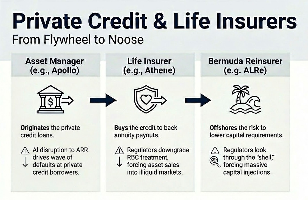 与银行体系相比,保险监管机构一直温和 - 甚至自满 - 但这是一次警钟。已经对私人信贷在人寿保险公司的集中感到不安,他们开始降级这些资产的风险资本处理。这迫使保险公司要么筹集资本,要么出售资产,在已经疯狂的市场中两者都无法以有吸引力的条款实现。