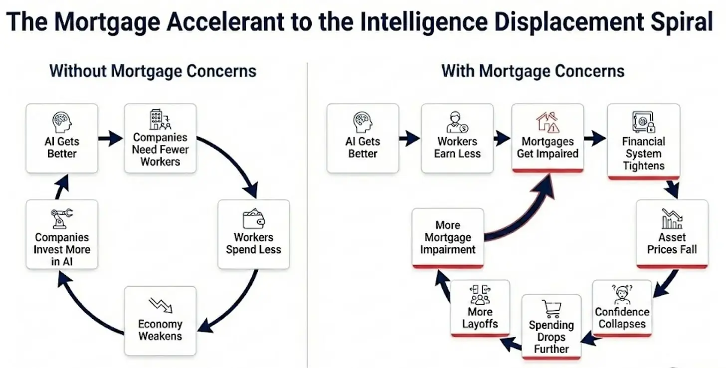 这是一个没有自然刹车的负反馈循环。人类智能置换螺旋。白领工人看到他们的收入能力(以及,理性地,他们的支出)结构性受损。他们的收入是13万亿美元抵押贷款市场的基石 - 迫使承保人重新评估优质抵押贷款是否仍然是良好的还款能力。