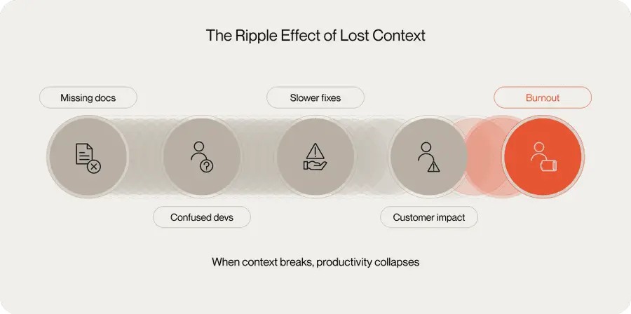 剩下的只有输出结果:PR(请求)、工单更新、部署。但产生该决策的决策链呢?消失了。永久消失了。