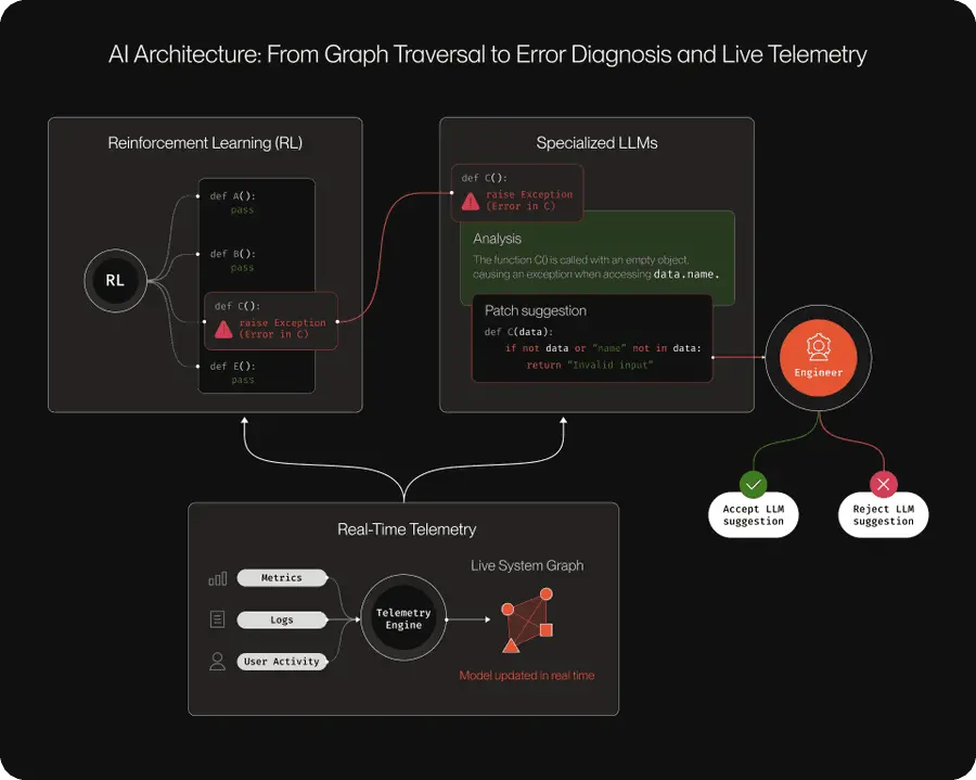 他们构建的是一个上下文图。这是一个动态模型,用于描述代码、配置、基础设施和客户行为在生产环境中的交互方式,而不是静态快照。它是一个持续更新的表示,能够捕捉决策产生结果的瞬间。