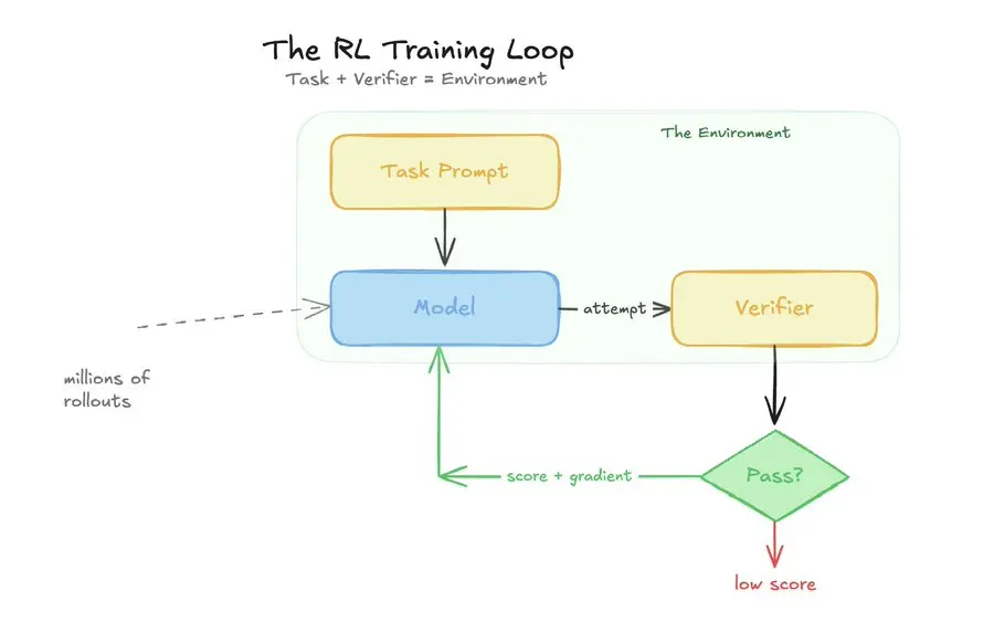“任务 + 评分器”的组合就是强化学习环境。你可以把它想象成模型的健身房。