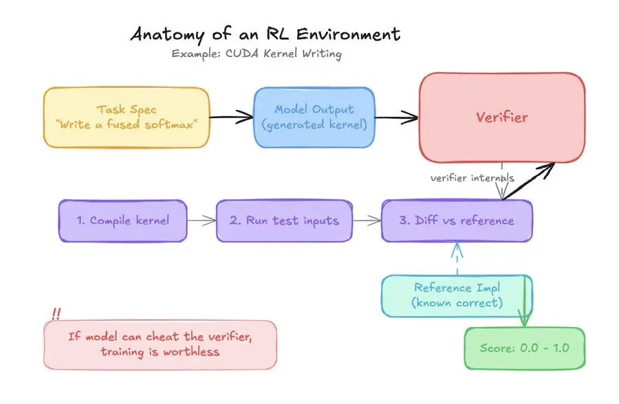 模型生成数千次尝试。验证器对每次尝试进行评分。梯度流动。模型编写 CUDA 内核的能力不断提高。在数百个不同的内核任务中重复此过程,即可显著提升模型的 GPU 编程能力。