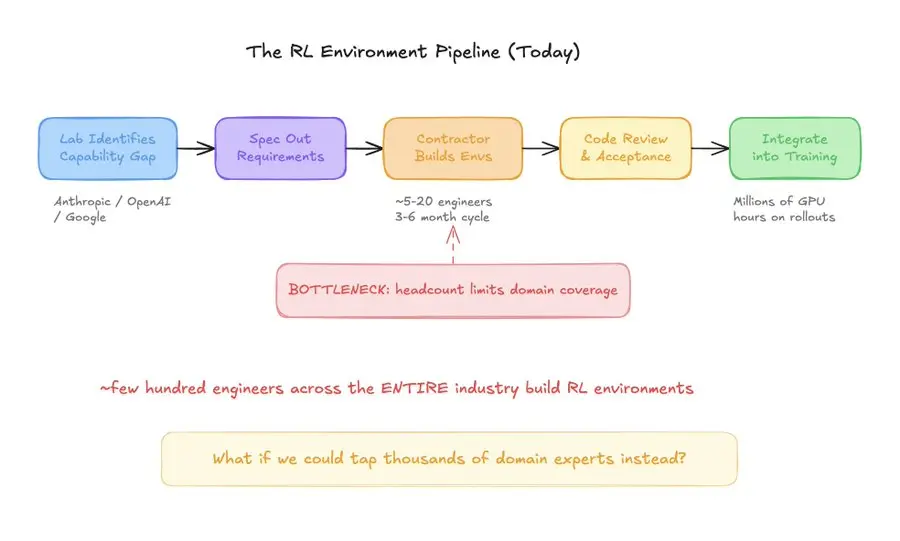 目前,整个行业可能只有几百名工程师在为前沿模型构建强化学习环境。对多样化、高质量环境的需求增长速度远远超过了构建这些环境的人才供应速度。实验室想要改进的每个新领域都需要特定领域的专业知识。你不可能让同一个 CUDA 内核专家同时构建用于医学推理、法律分析或博弈论的环境。