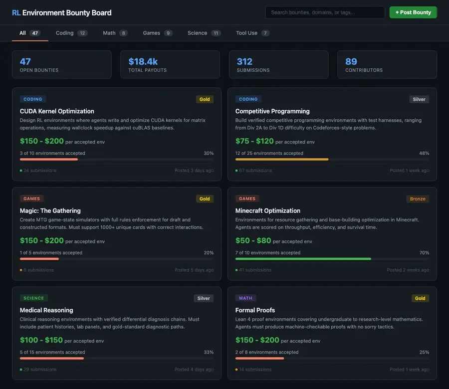 想象一下:你不再需要委托公司构建内核环境,而是发布赏金。“我们需要 500 个用于 Python 算法挑战的强化学习环境,难度范围为 Codeforces 1200-1800,验证者必须能够处理 X、Y、Z 等边界情况,每个被接受的环境奖励 50-200 美元。” 世界各地成千上万的竞技程序员看到赏金后,便开始着手构建。
