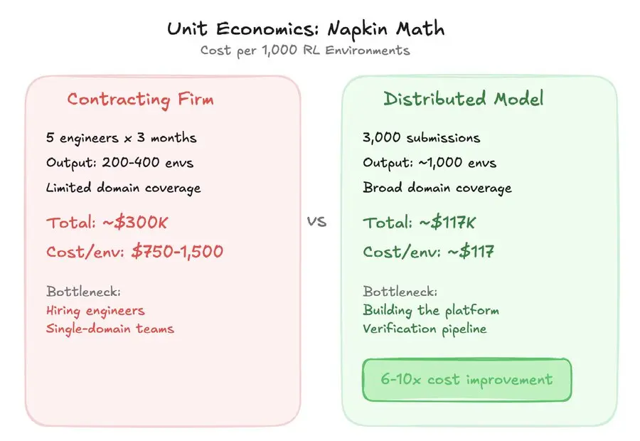 这大约能带来 6-10 倍的成本提升,而且由于您利用了更大的人才库,因此可以获得更广泛的领域覆盖。这些数字只是粗略估计——实际成本很大程度上取决于接受率、支付结构以及自动化验证的水平——但经济方向非常明确。