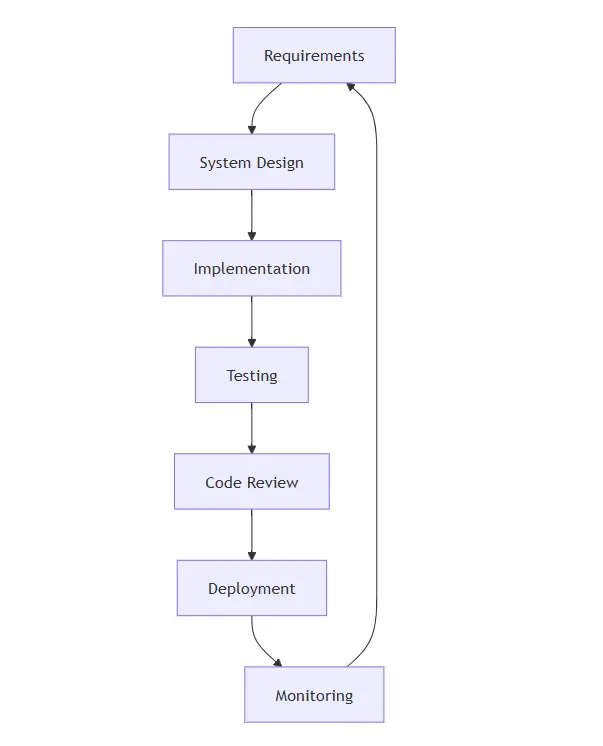 每个阶段都有自己的一套工具、仪式和小型行业。需求用 Jira。设计用 Figma。实现用 VS Code。测试用 Jest。代码评审用 GitHub。部署用 AWS。Datadog 用于监控。