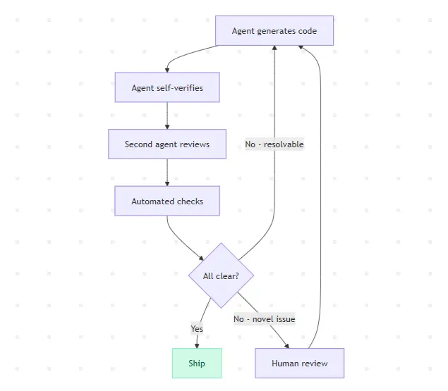 审查需要从头重新考虑。要么让它成为代码生成本身的一部分,要么让代理在计划文档中验证自己的工作、运行测试、检查回归、验证架构约束,或者由第二个代理对第一个代理的输出进行审查。对抗性代理会在拟变更的各个维度进行挑战。我们已经有工具可以做到这一点。人机结合的审查成为例外情况,仅在自动验证无法解决冲突或变更确实新颖时触发。