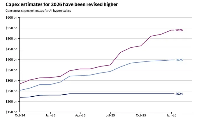 2026年,亚马逊将在基础设施上花费2000亿美元,比去年增长53%。整个软件板块的股票全线崩盘。Adobe、Salesforce和ServiceNow今年至今各下跌了25%至30%。标普北美软件指数经历了自2008年以来最糟糕的1月。摩根大通估计,在几周内,约2万亿美元从软件市值中蒸发。