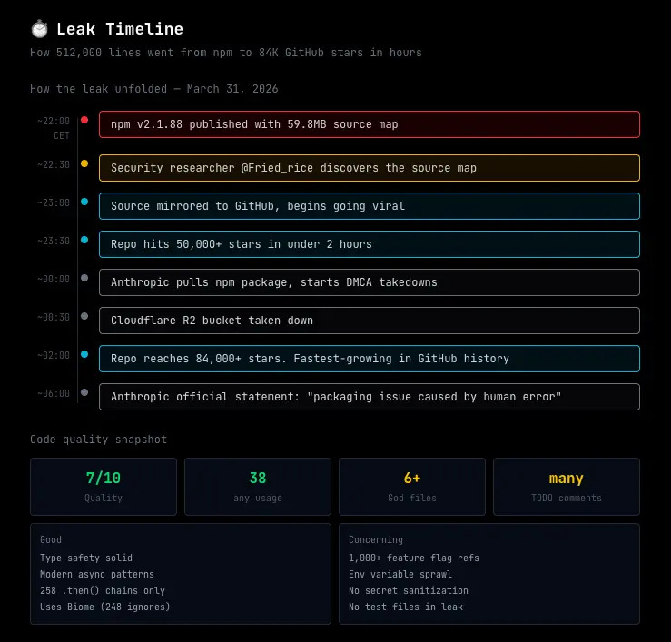 这不是故意的。 我知道人们在争论这个,因为时间点与 4 月 1 日吻合,而且 Anthropic 在公关方面度过了艰难的一周(对 OpenCode 项目发出停止和终止函)。但证据很清楚:他们一直在向 GitHub 仓库发送大量 DMCA 撤除通知,他们撤回了 npm 包,他们的 Cloudflare R2 存储桶被关闭了。你不会用计划好的发布来做这些。战略路线图的暴露成本太高了,尤其是在 IPO 准备期间。t3.gg 的 Theo 说得好:"如果你认为这是故意的,我有几座桥要卖给你。"