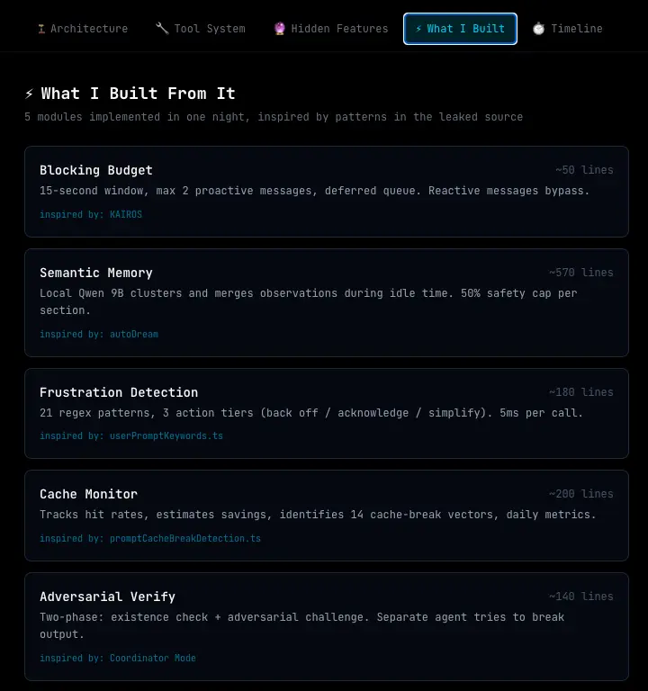 我不仅仅是阅读泄露。我把它当作学习练习并基于它构建东西。当晚,我实现了五个受泄露源码中模式启发的模块: