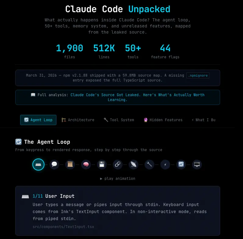 我构建了一个交互式探索器,映射了整个智能体循环、所有 50 多个工具、架构系统和隐藏功能。如果您想在不阅读原始 TypeScript 的情况下可视化探索泄露的架构,从那里开始。