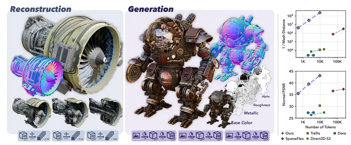 左图:使用 TRELLIS.2 重建 153⁶³ 个资源。尽管潜在表示非常紧凑(见下方的标记计数),它仍然能够忠实地恢复极其精细的几何和材质细节,支持任意拓扑结构,并保留封闭结构(见第二行)。