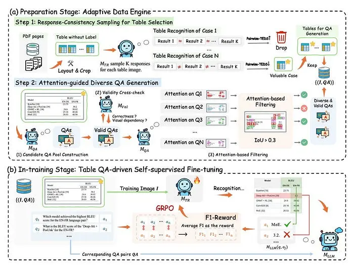 3. 强化学习(表格QA驱动的GRPO + 非法样本过滤):使用QA F1分数作为奖励,并过滤掉可能向训练注入噪声的损坏输出。训练由识别的表格结构质量引导。如果生成的结构允许LLM正确回答问题,VLM获得高奖励。如果答案匹配预期结果,它获得高奖励。如果输出无效,模型破坏了表格结构,它会在造成训练不稳定之前被过滤掉。