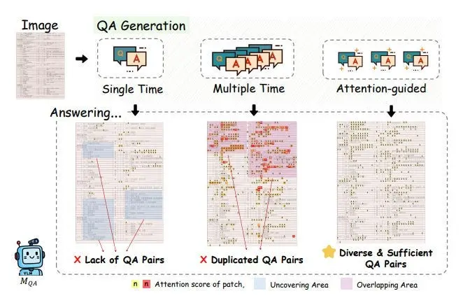 - 问题生成:基于注意力的多样化QA生成是一个三步过程:构建多样本QA候选池,交叉验证视觉依赖性(有图像可回答,无图像不可回答),然后选择注意力导出的视觉源重叠度低(IOU阈值化)的QA对,以提高覆盖率并减少冗余。