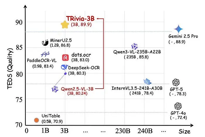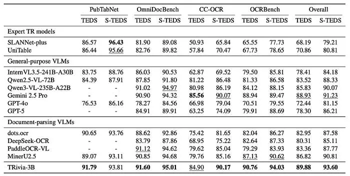 与Gemini 2.5 Pro(总体88.93 TEDS / 91.23 S-TEDS,不包括未评估的PubTabNet)相比,TRivia-3B在大多数基准上表现更好。唯一的例外是CC-OCR,Gemini略高于TRivia-3B(85.56 TEDS vs 84.90)。
