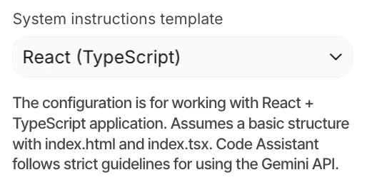 - 代码输出: 默认情况下,Google AI Studio生成React/TypeScript代码,这是行业标准。但你可以通过在提示中提供特定指令或通过点击模型并选择右侧面板中的系统指令模板来更改它。
