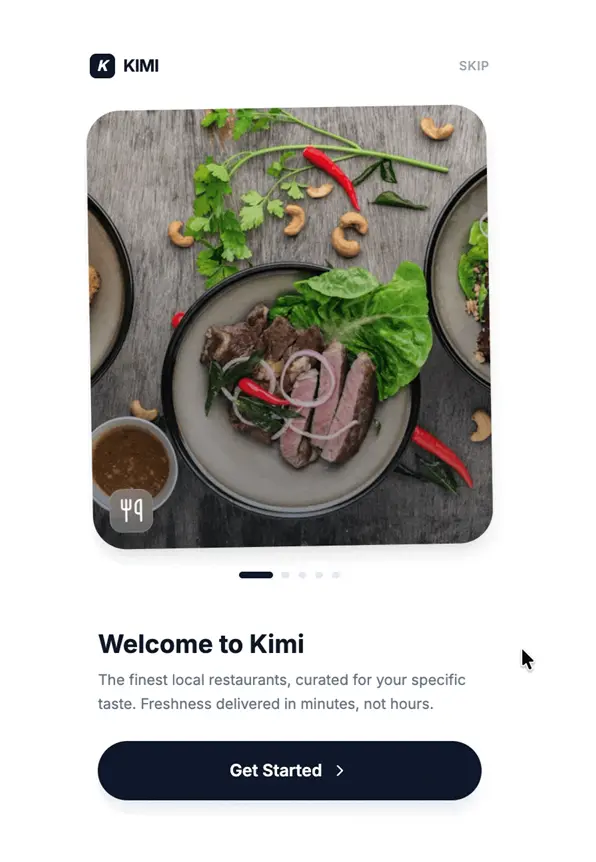 为名为Kimi的外卖移动应用创建一个5步入职流程。