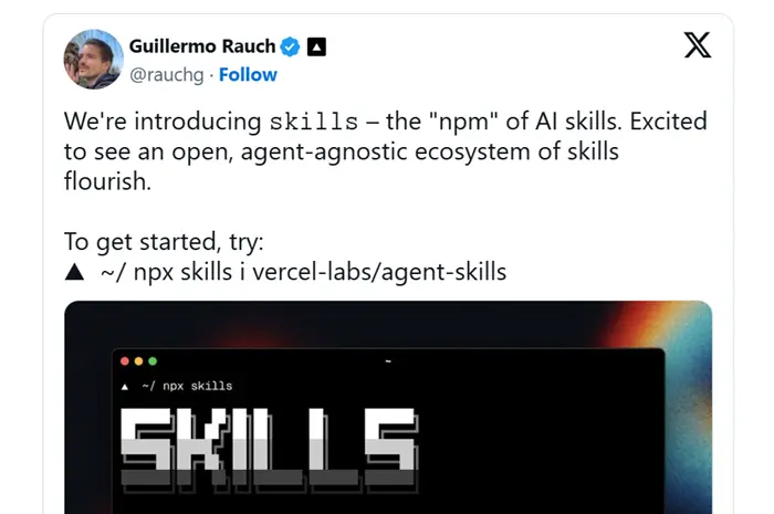 我们正在推出 skills —— "AI 技能的 npm"。很高兴看到一个开放的、代理无关的技能生态系统蓬勃发展。