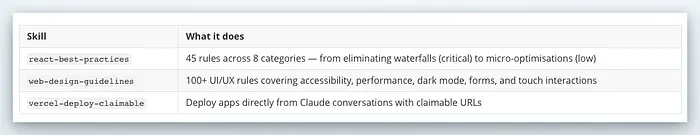 仅 React 最佳实践技能就非常充实。它与我在上周关于 Vercel 的 40 多条规则的文章中解析的内容相同 —— 但现在打包供机器直接消费。