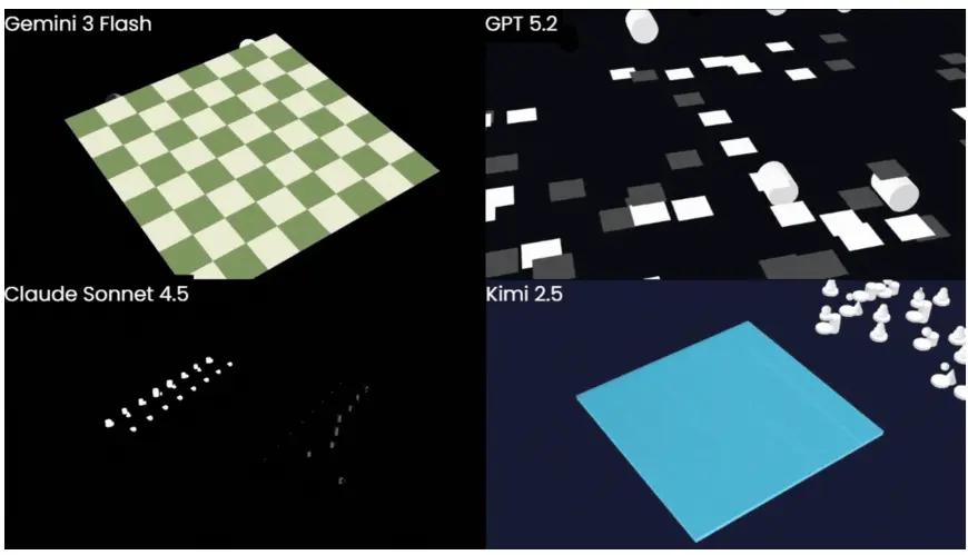 我用同样的零样本最小指导提示测试了Gemini 3 Flash、GPT 5.2、Claude Sonnet 4.5和全新的Kimi 2.5-Instant模型,只是为了看看它们能做什么开箱即用。