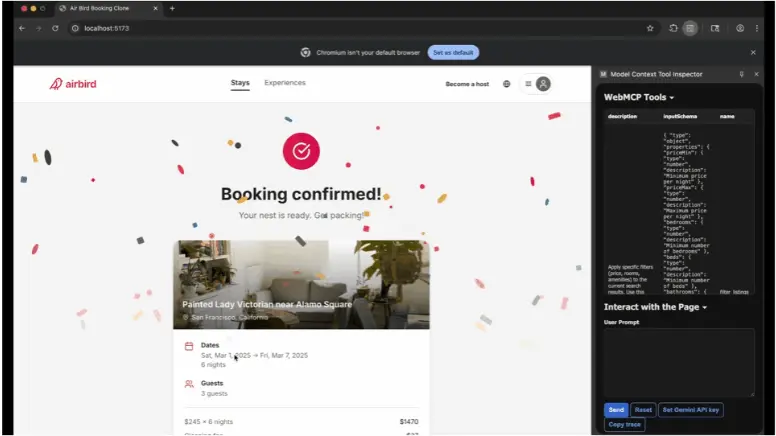 在Magic Patterns的帮助下,我创建了一个名为"AirBird"的预订市场,这是一个基于React的Web应用,并集成了WebMCP命令式API。与声明式API(使用HTML属性处理简单表单)不同,命令式API允许与应用程序状态进行深度集成——更多关于交互类型的信息在这里。