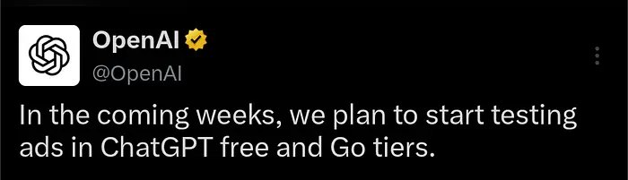 OpenAI 本周宣布他们将开始在 ChatGPT 的免费层中测试广告。这意味着如果我付费,我就是安全的。这也意味着我被迫付费以保证安全。这也意味着,如果我不能或不想付费,我三年来一直用作助手的工具会在我的利益之前关心别人的利益。