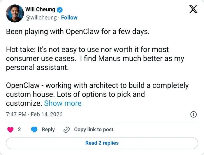 过去一个月,我一直生活在 OpenClaw 生态系统中。像你们许多身处创业和开发领域的人一样,我很早就加入了 OpenClaw 并开始 tinkering。它感觉像是未来:一个本地优先、开源的助手,全天候运行,接入我的 Slack,还能无限定制来管理我的社交媒体。