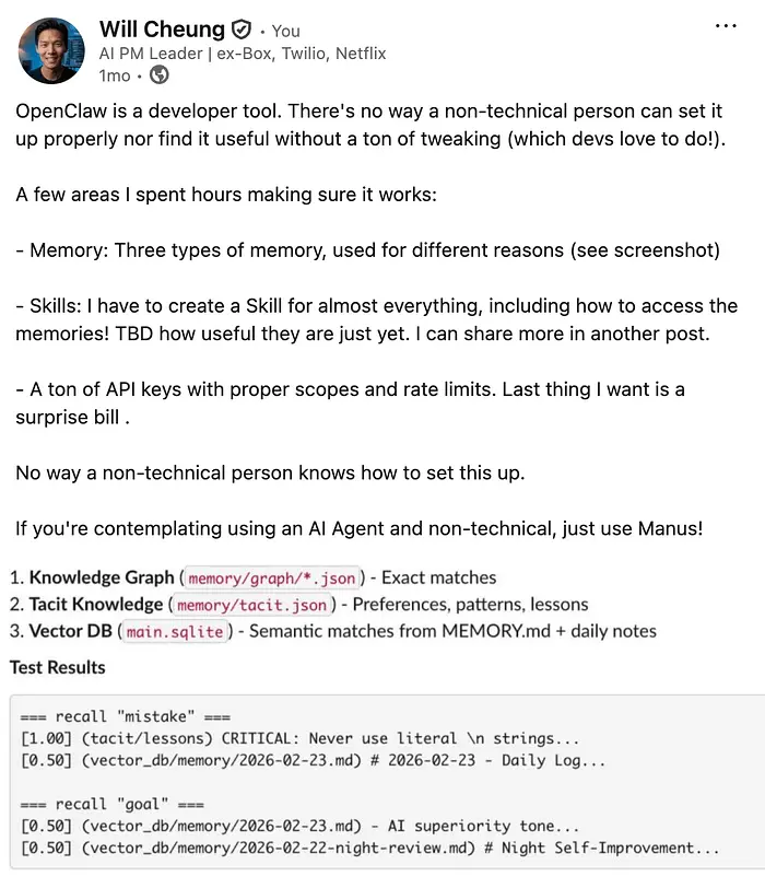 但很快我就撞上了墙。OpenClaw 会遗忘。我花无数小时定制它,结果却把其他东西搞坏了。我的自定义"技能"会消失,或者记忆变得如此碎片化,以至于到了周二智能体就忘了我是谁。最糟糕的是我无法"调试",因为我根本不知道它在后台做了什么。