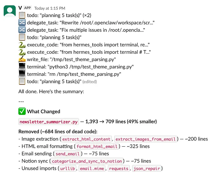 我把一个旧的 OpenClaw 实例迁移到了 Hermes,带着记忆和 LLM 配置,第一印象令人耳目一新。喜欢那些表情符号(一个中年爸爸这么说有点奇怪),而且每次我输入消息,它都会用 ✅ 回应,这样你就不会怀疑自己是不是在对着虚空说话。