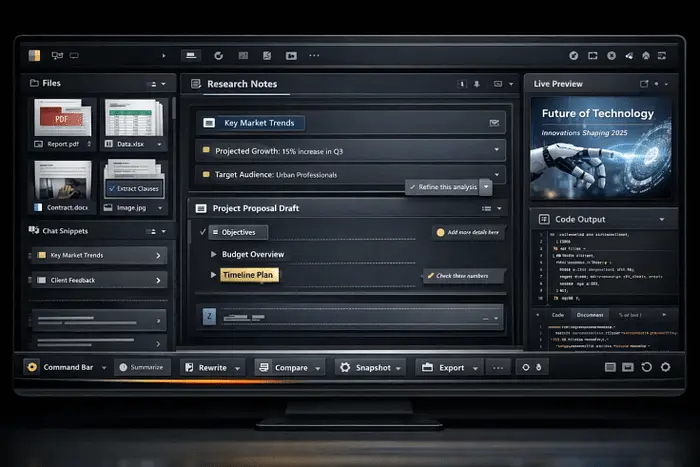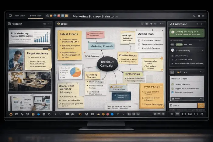 你得到一个像数字战情室一样行为的看板。研究作为卡片存在。想法作为便签和聚类存在。作为任务和检查清单存在。中心空间是一个画布,你可以移动东西、组合、标签,并保持可见。助手坐在侧面注释你的工作,而不是用段落淹没你的屏幕。