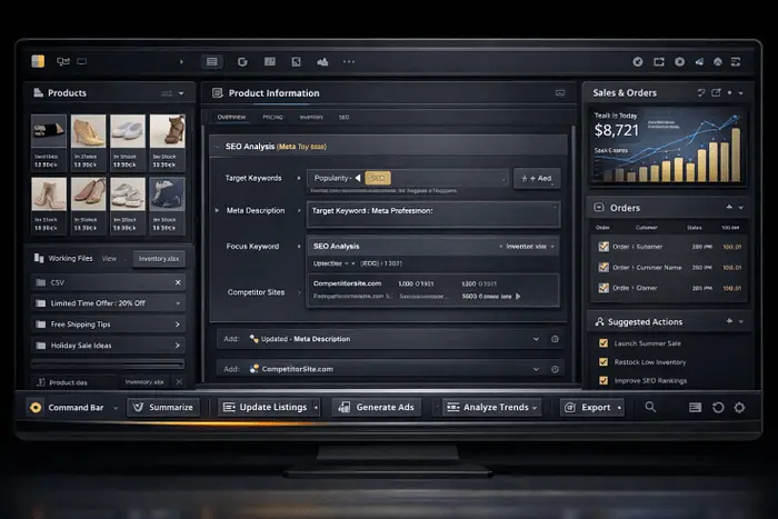 它必须有一个驾驶舱,需要流畅、多层次、可命令(不可提示),当然它带有一个浮动操作栏,左侧面板用于上下文,右侧面板用于预览,底部栏用于命令历史。聊天输入成为众多入口点之一,但不是祭坛。这就是你让它成真的方式。