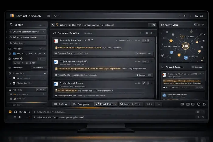 真正的语义搜索是关于交互的,而不仅仅是匹配关键词。你应该能够悬停在实体上,查看关系,展开节点。从UI中获取"显示更多类似这个"。固定东西。并排比较答案。单击细化。将查询链接成线程而不丢失跟踪。搜索应该成为带有视觉记忆的对话。