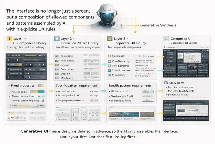 不是为一个任务设计一个屏幕,你构建一个UI部件库。日期选择器。切换。范围滑块。预览卡片。比较表格。引用块。操作栏。确认对话框。进度时间线。结果网格。AI根据你的意图和它看到你在做什么从那个库中选择。它组装一个屏幕,就像乐高积木组装成你可以实际使用的东西,然后当情况变化时重新排列积木。