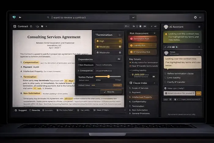 你说你想审查合同。界面渲染合同视图,带有高亮条款、风险面板、条款索引和用于重写部分的操作栏。你可以单击终止条款并查看其依赖关系。你可以调整阈值并看到建议立即更新。助手成为组件的编排者,而不是无尽文本的作者。