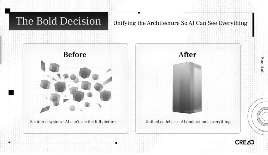 我们的旧架构分散在多个独立系统中。一个单一变化可能需要触及三或四个仓库。从人类工程师的角度来看,它是可管理的。从AI代理的角度来看,是不透明的。代理无法看到全貌。它无法推理跨服务的影响。它无法本地运行集成测试。
