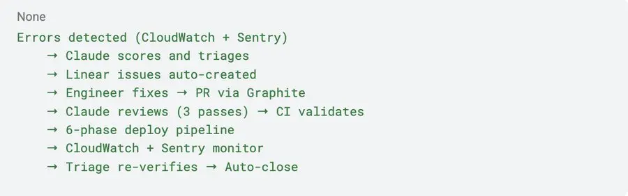 当工程师推送修复时,相同的管道处理它。三个Claude审查通道评估PR。CI验证。六阶段部署管道通过dev和prod提升,每个阶段都有测试。部署后,分诊引擎重新检查CloudWatch。如果原始错误解决,Linear票据自动关闭。