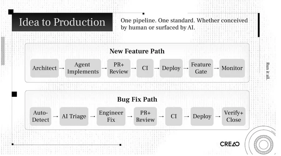 AI将任务分配给人类。分诊系统找到一个bug,创建票据,表面诊断,并分配给合适的人。这个人调查、验证并批准修复。AI制作PR。人类审查是否有风险。